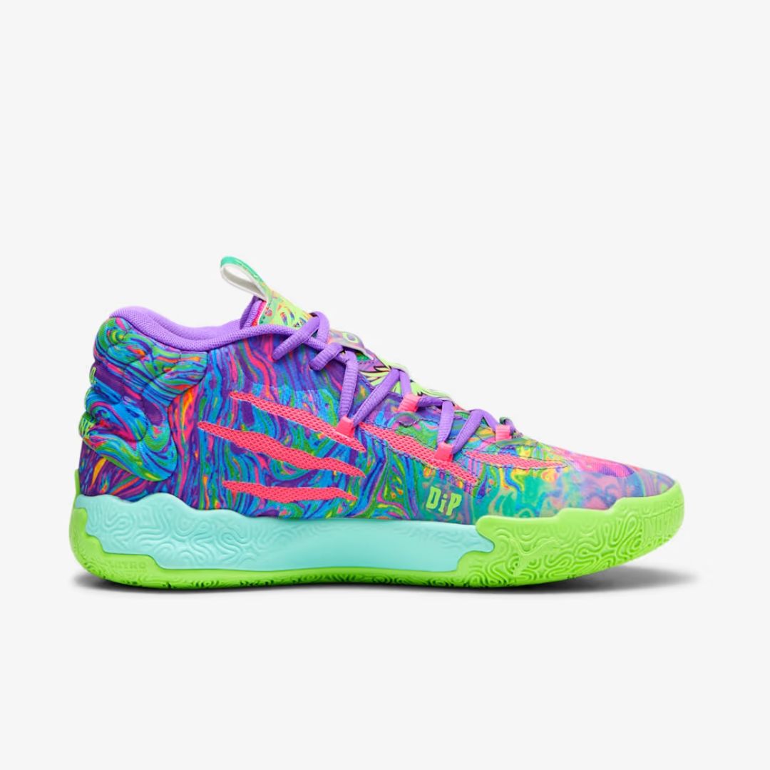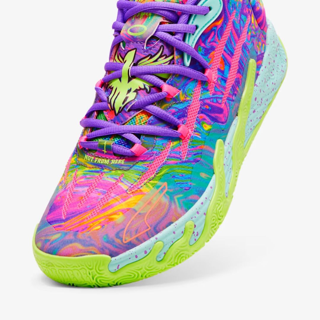 LaMelo Ball’s third signature shoe MB.03 takes a trip to the never before seen alternative universe that is the Melo world. Highlighted by slime inspired rubber wrap-ups and an engineered knit upper with scratch cutouts, the MB3 is truly Not From Here. The slime sole and space-age PUMA Hoops tech make tournament ready look interplanetary.