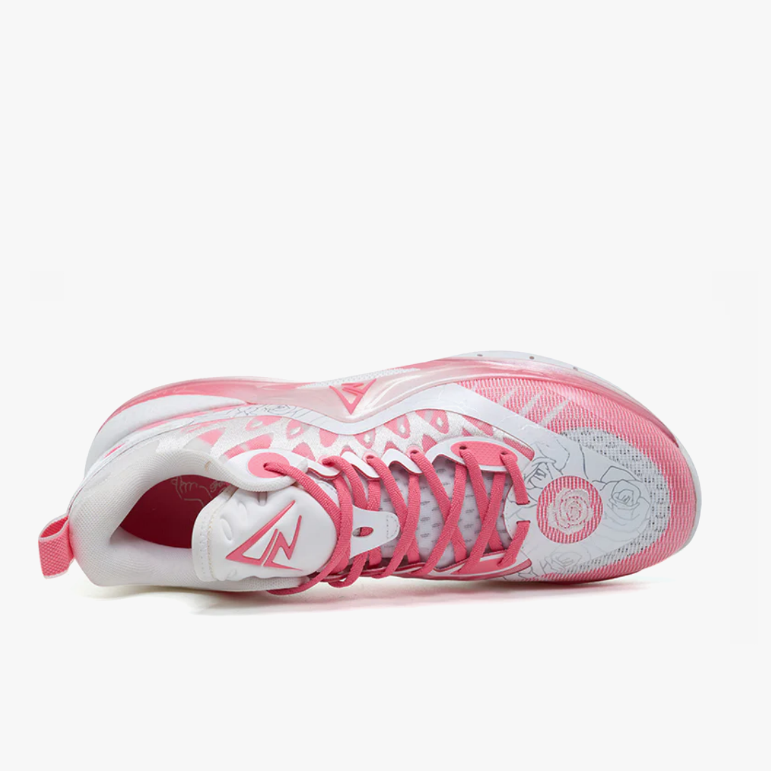 The Rigorer AR2 "Valentine's Day" brings a romantic touch to the basketball court. The stylish design combines a breathable white and pink upper with delicate graphic details like rose motifs. The transparent midsole and subtle branding give the sneaker a modern look. Equipped with responsive cushioning and a grippy outsole, the shoe offers optimal comfort and stability. Perfect for players who want to combine performance with a unique design.