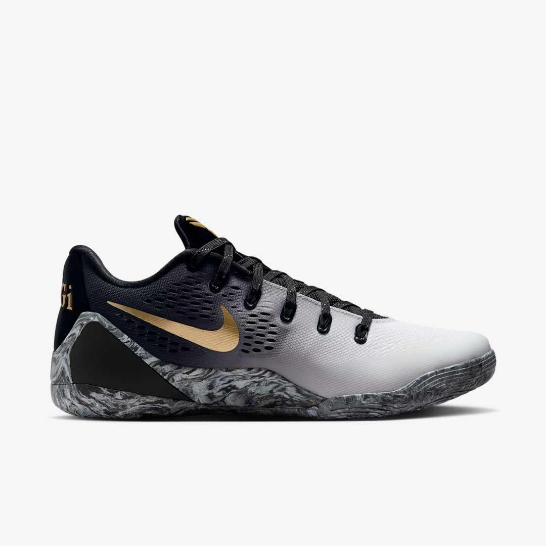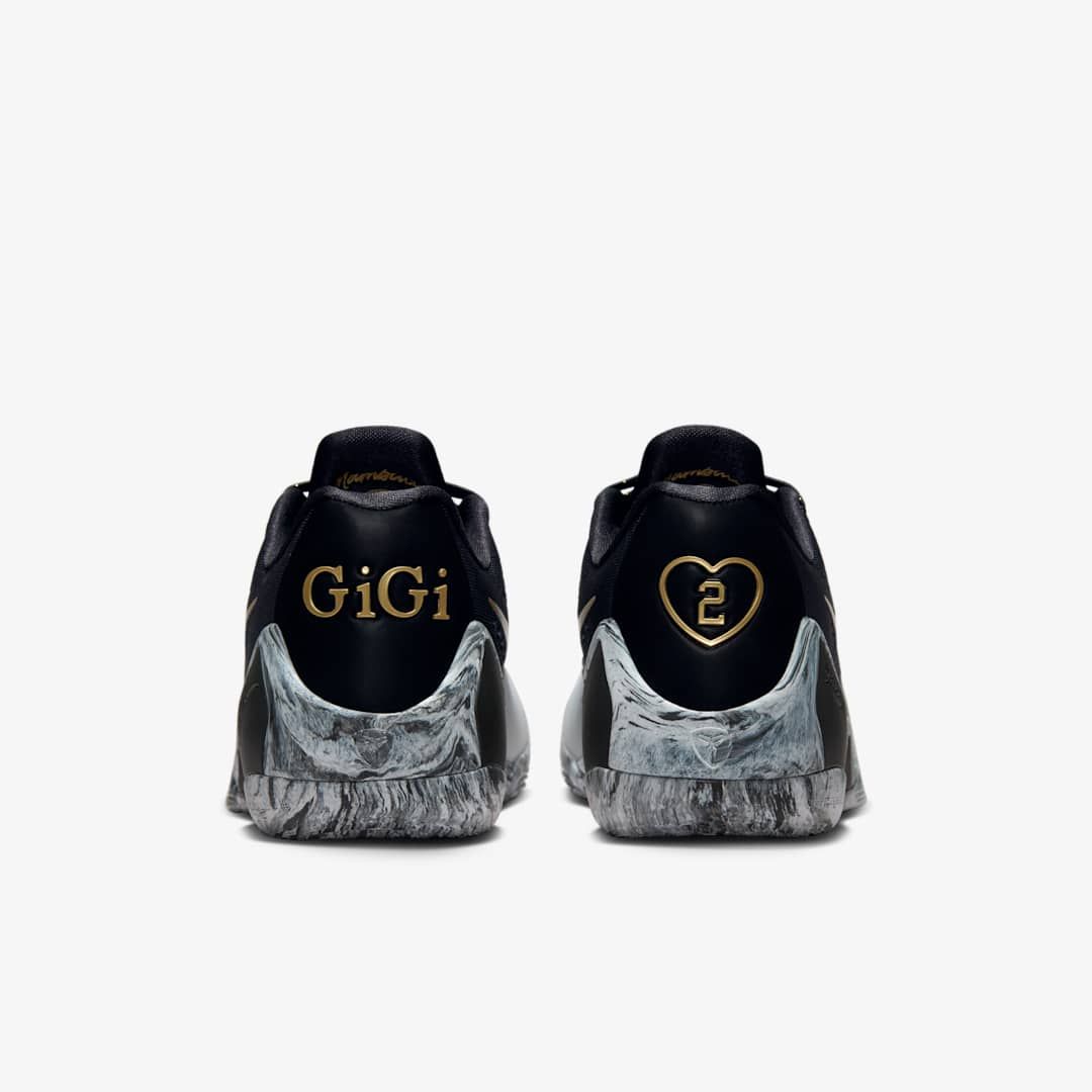 The Kobe 9 Protro 'Mambacita' celebrates Gianna "Gigi" Bryant's transformational legacy of shaping the future of women's sport. Complete with a black and white mesh upper and Metallic Gold accents, it features Gigi's name on the left heel and a heart encircling her jersey number on the right. The Mambacita logo graces the inner tongue and each pair comes with a golden Mambacita heart hang tag.