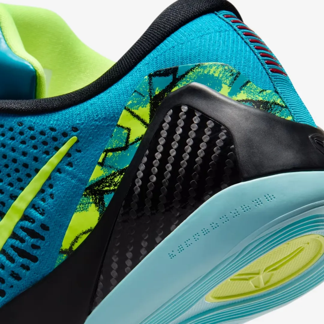 First released in 2014 as an eye-catching, high-top model, this bold edition of the Kobe 9 returns more than a decade later, poised for the hardwood in Protro form. True to the original colourway, it combines artisan Neo Turquoise and vibrant Volt hues—this time, in a sleek, low-top design.